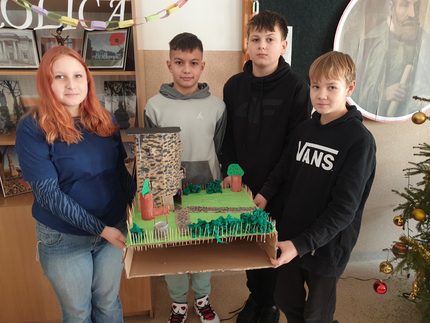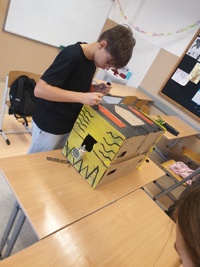 I grupa wykonała makietę podwórka pana Tomasza- jednego z głównych bohaterów noweli. Uczniowie z dbałością odtworzyli przestrzeń opisaną w lekturze, zwracając uwagę na jej funkcję i znaczenie dla przebiegu wydarzeń.